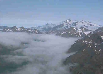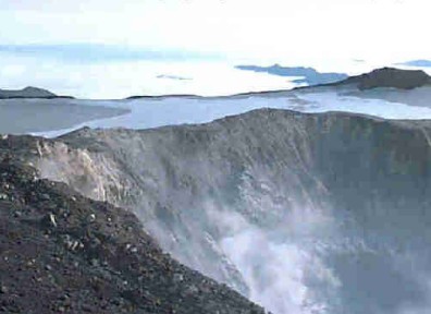 farther south. Judging from the clean layers of snow exposed in crevasses, the recent phreatic explosion is an unusual event that formed the present crater and affected the