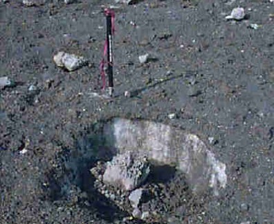 of ejecta lies at the crater's edge, atop the intracaldera glacier. In the near-field, ejecta blocks range upward to 1 m in diameter. Some blocks were obviously hot, as they melted