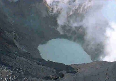 100-m-diameter lime green lake. Irregular lines of clear water within the opaque body attest to vigorous upwelling. There is a strong sulfur smell, accompanied by the