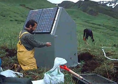 Bob Hammond and Milton Garces (back) install one of the south-side stations. All material is brought in by helicopter.